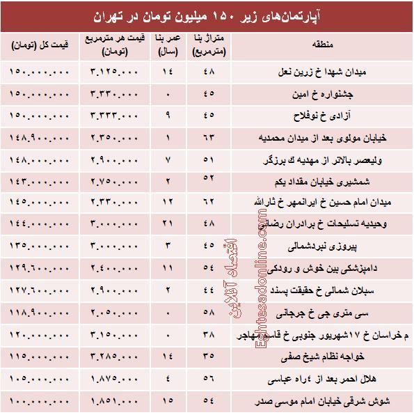 آنچه در زیر میآید جدول قیمت معاملات انجام شده آپارتمانهایی در مناطق مختلف شهری تهران طی تیر ماه ۹۵ است که می توان با ۱۵۰ میلیون تومان خرید.لازم به ذکراست که این ارقام مربوط به اعلام سامانه اطلاعات بازار املاک ایران می باشد