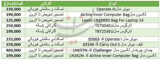 به گزارش خبرنگار گروه اقتصاد خبرگزاری میزان، در چند سال اخیر به واسطه افزایش تقاضا و استفاده از محصولات فناوری، لپ تاپها جایگاه ویژهای را در بین عموم افراد پیدا کردهاند، مصرف کنندگان در اکثر اوقات به دنبال آن هستند تا سیستم قابل حمل خود را به همراه داشته باشند، که این موضوع نیاز به کیف یا پوششی برای نگهداری از لپ تاپ دارد، از این رو به میزانی که لپ تاپ یا سیستمهای قابل حمل خریداری میشود، کیف لپ تاپ نیز خریداری میشود. در جدول زیر قیمت برخی از انواع کیف لپ تاپ آمده است؛