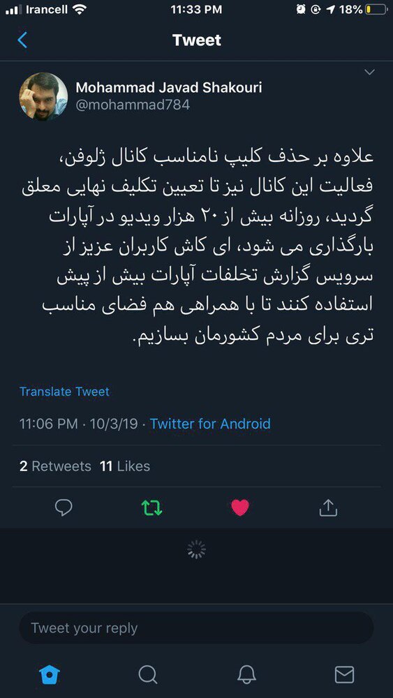 با گسترده شدن دامنه این اعتراضات، محمدجواد شکوری مقدم، موسس آپارات با انتشار توییتی خبر از تعلیق این برنامه اینترنتی داد و نوشت: «علاوه بر حذف کلیپ نامناسب کانال ژلوفن، فعالیت این کانال نیز تا تعین تکلیف نهایی معلق شد. روزانه بیش از ۲۰ هزار ویدئو در آپارات بارگذاری میشود، ای کاش کاربران عزیز از سرویس گزارش تخلفات آپارات پیش از پیش استفاده کنند تا با همراهی هم فضای مناسبتری برای مردم کشورمان بسازیم.»