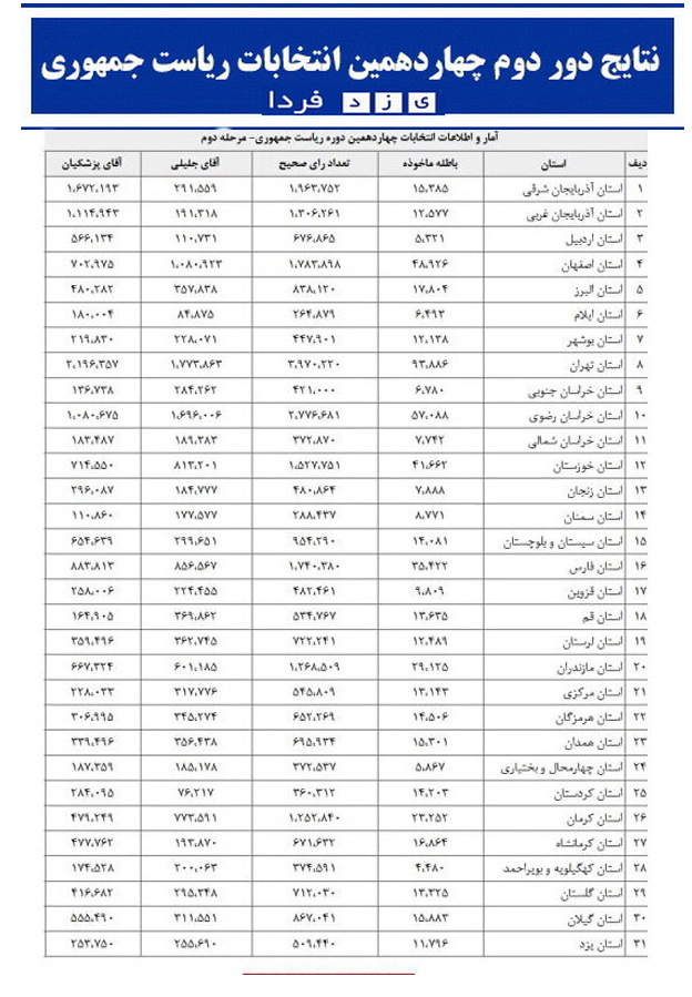 به گزارش یزدفردا: ستاد انتخابات کشور آمار و میزان آرای نامزدها به تفکیک استانهای سراسر کشور در مرحله دوم انتخابات چهاردهمین دوره ریاست جمهوری را اعلام کرد.