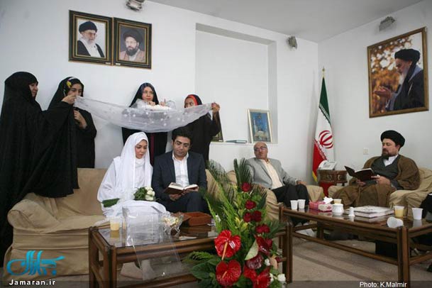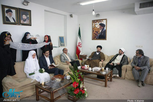 فرزاد حسنی و آزاده نامداری به همراه خانواده هایشان وارد حسینیه جماران میعادگاه عاشقان روح الله شدند و بعد از دقایقی جهت جاری شدن صیغه عقد به دفتر حجت الاسلام حاج سیدحسین خمینی وارد شدند.