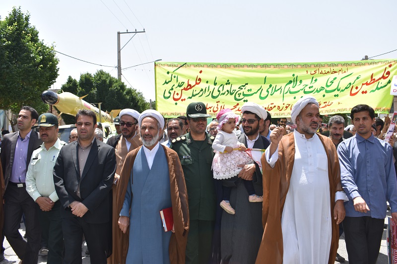 دراین راهپیمائی فرماندار ، امام جمعه ، فرماندهان نظامی و انتظامی ، مسئولان ادارات و نهادها ، خانواده های معظم شاهد ، بسیجیان و اقشار مختلف مردم پیر و جوان خرد وکلان در این راهپیمائی با شکوه حضوری حماسی خلق کردند و به معامله قرن نه گفتند .
