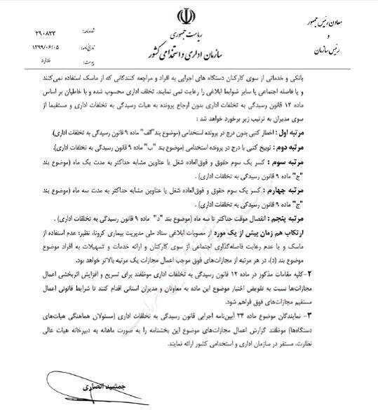 بنا بر این بخشنامه که بر اساس مصوبات ستاد ملی کرونا در تاریخ ۲۵ مرداد امسال، تدوین شده و به تأیید رئیس جمهور نیز رسیده است، عدم رعایت شیوه‌نامه‌های بهداشتی مقابله با کرونا از سوی کارکنان و مدیران دستگاه‌های اجرایی تخلف محسوب می‌شود.