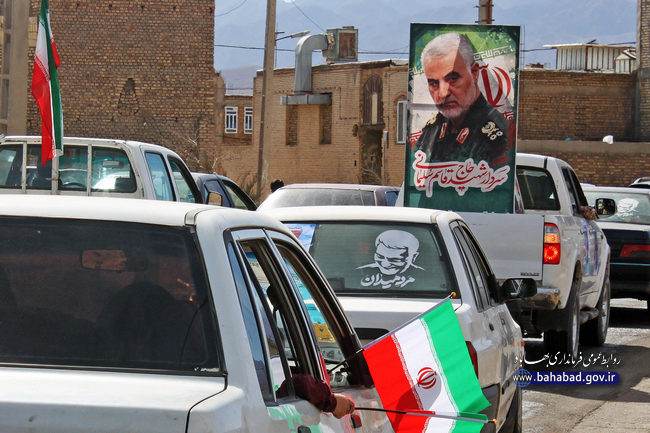 مردم بهاباد در این مراسم که برخی از آنها به صورت خانوادگی در خودروها حضور داشتند، با تزئین وسیله نقلیه خود به پرچم ایران و پوسترهای انقلابی، جلوه های ویژه ای را خلق کردند.