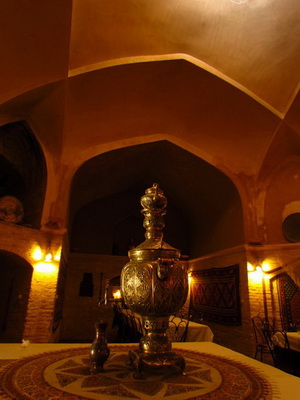 در داخل بنا عمدتاً از تزیینات آجر در نما استفاده شده که تابع طرح 12 ضلعی حیاط یا صحن مرکزی آن است. قسمت شاهنشین در بدنه و سقف دارای اندود گچ و کاربندی است.