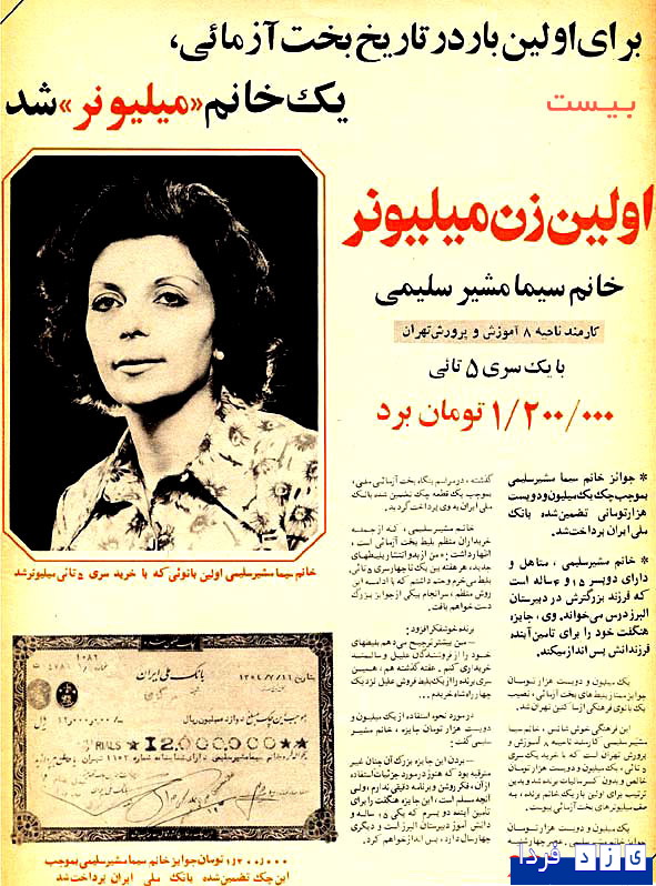 جالب و خواندنی یزدفردا :اولین زنی که میلیونر شد یک بانوی فرهنگی تهرانی بود که با خرید بلیط بخت آزمایی برنده شد و در آن زمان البته میلیون خیلی بود نه حالا که میلیارد هم !!!!!!