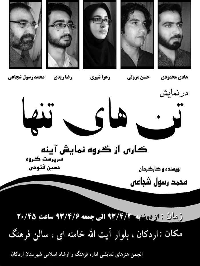 نمایش تن های تنها تا جمعه ۱۳۹۳/۴/۶ ساعت ۲۰:۴۵ در تالار فرهنگ واقع در بلوار آیت الله خامنه ای اردکان به روی صحنه است .