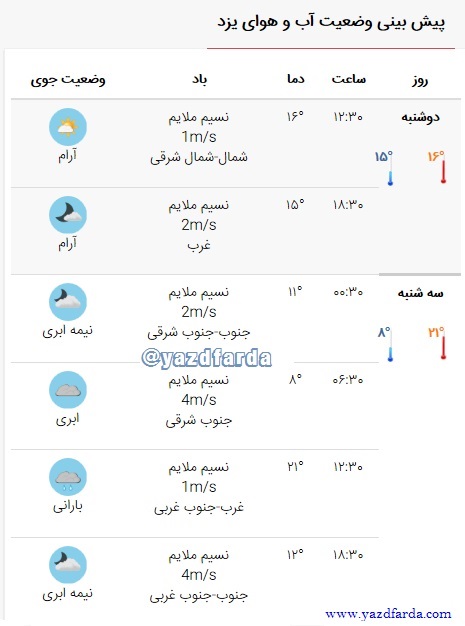 امروز (دوشنبه 14 آبان ) استان یزد آسمانی کمی تا نیمه ابری همراه با افزایش دما و گاهی وزش باد پیش بینی می شود همچنین بر اساس تجزیه و تحلیل آخرین نقشههای هواشناسی، وضعیت جوی فردا نیمه ابری است و از فردا بتدریج شاهد بارندگی، وزش باد و کاهش دما در استان یزد هستیم