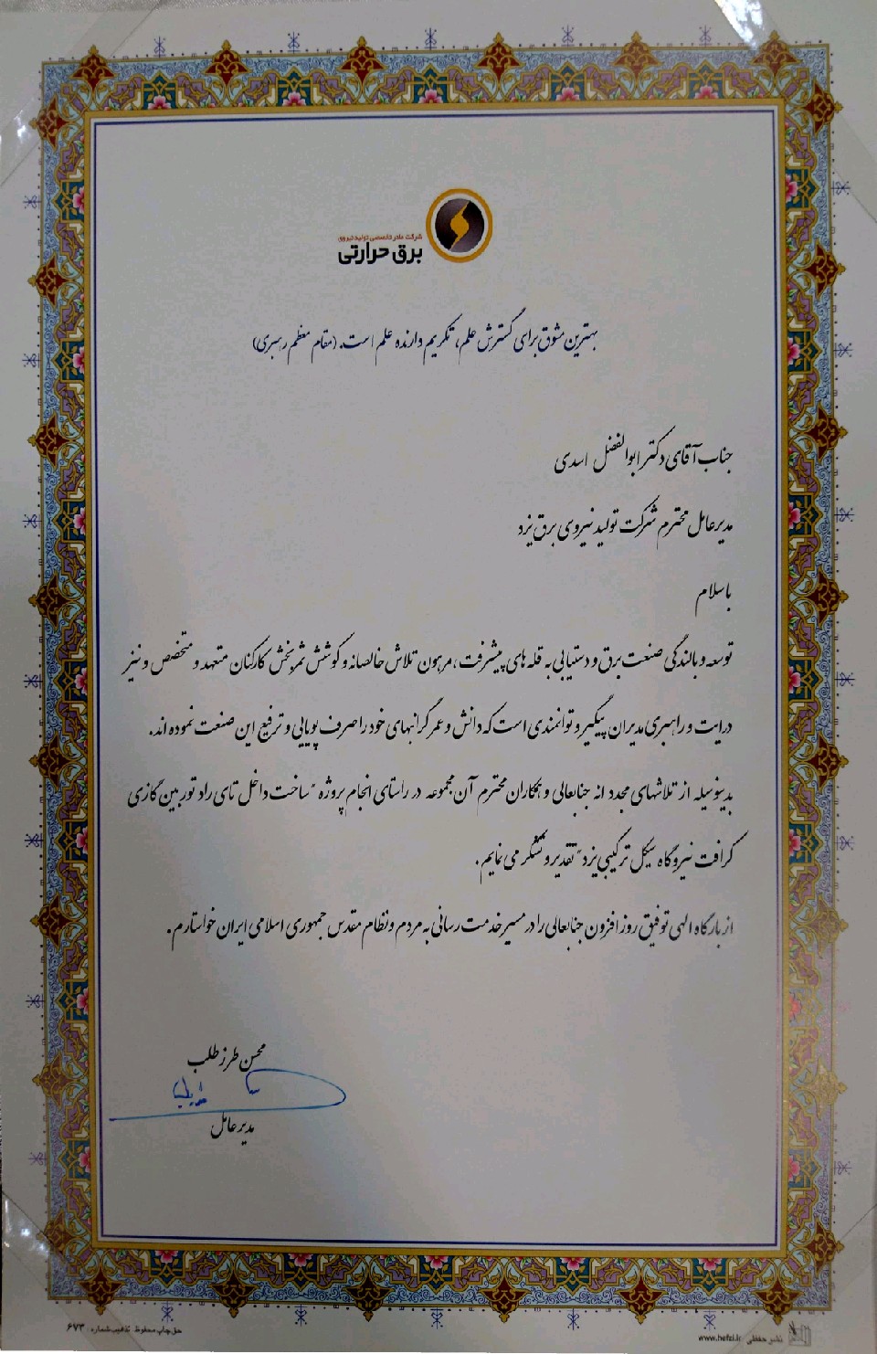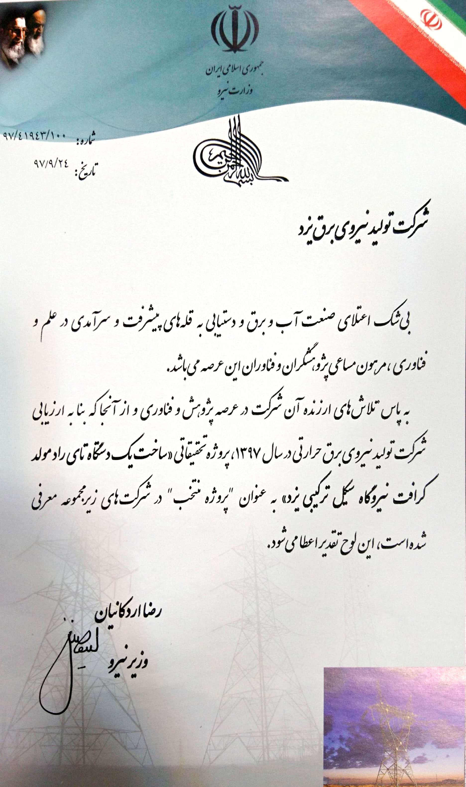 در این جشنواره که با حضور رضا اردکانیان وزیر نیرو و محسن طرزطلب مدیرعامل محترم شرکت مادر تخصصی تولید برق حرارتی در محل پژوهشگاه نیرو برگزار شد؛ از شرکت تولید نیروی برق یزد برای پروژه تحقیقاتی «ساخت یک دستگاه تای راد مولد کرافت نیروگاه سیکل ترکیبی»، با اهداء لوح مکتوبی بهعنوان پروژه برتر وزارت نیرو قدردانی شد.